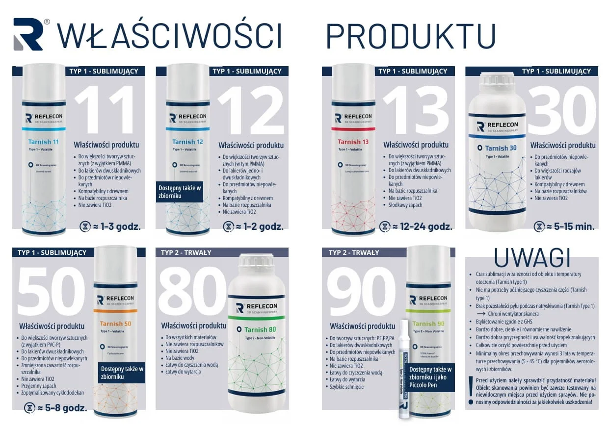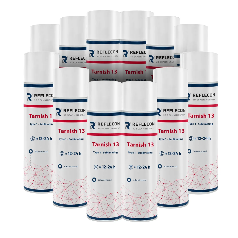 Reflecon Tarnish 13 wyróżnia się najdłuższym czasem sublimacji spośród wszystkich sprayów sublimujących z serii Reflecon. Odparowuje dopiero po 10-24 godzinach, co czyni go idealnym do długich i precyzyjnych sesji skanowania. Tworzy stabilną, cienką warstwę, która utrzymuje się na powierzchni przez wiele godzin bez konieczności ponownego nanoszenia. Doskonale sprawdza się przy skanowaniu dużych lub złożonych obiektów wymagających wieloetapowej rejestracji. Jest kompatybilny z szerokim zakresem materiałów, z wyjątkiem PMMA, choć zaleca się testy na PVC, PS i PU/PUR. Tarnish 13 to najbardziej wytrzymały czasowo spray sublimujący, zapewniający niezawodność i komfort pracy bez presji czasu.