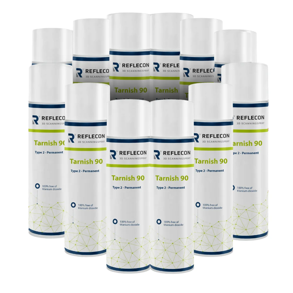 Reflecon Tarnish 90 to spray matujący do skanowania 3D, przeznaczony do trudnych powierzchni, takich jak materiały ciemne, przezroczyste i błyszczące. Poprawia kontrast i ułatwia uzyskanie dokładnego odczytu geometrii.