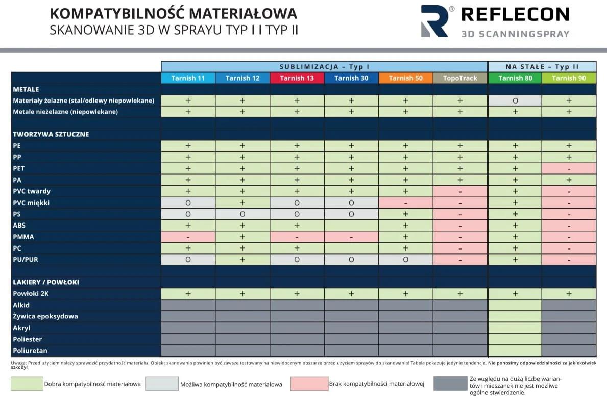 - Spray nie sublimuje, dlatego po zakończeniu skanowania należy usunąć go z powierzchni.