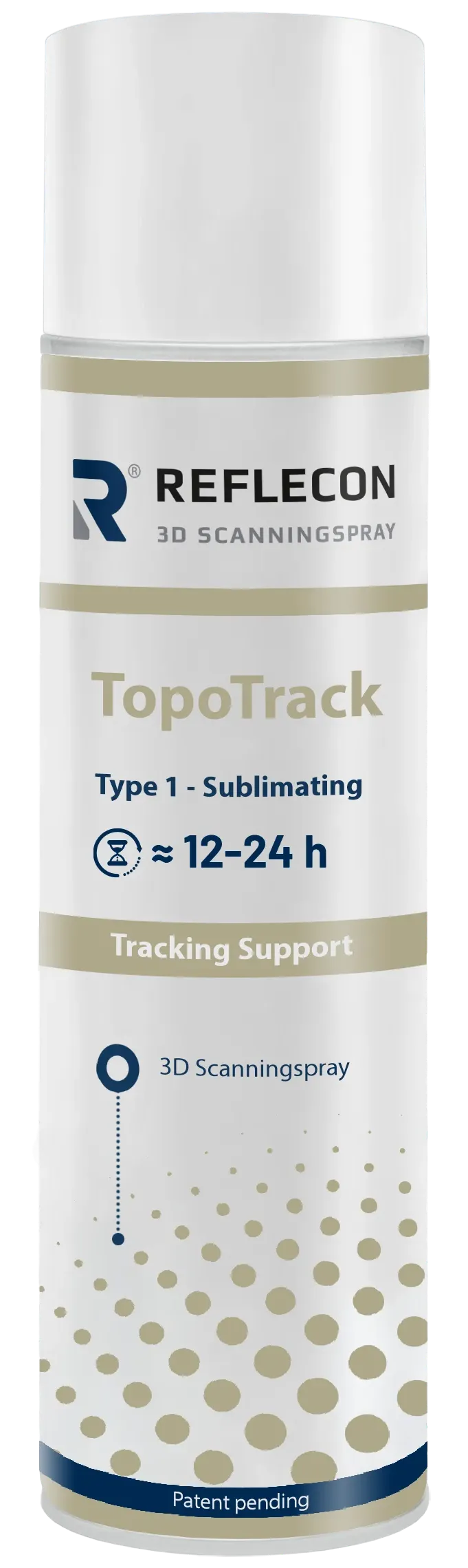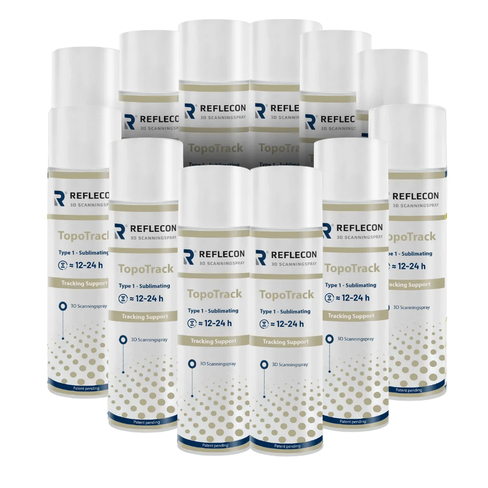 Reflecon TopoTrack to specjalistyczny spray sublimujący do skanowania 3D, który tworzy drobną, nieregularną teksturę na powierzchni obiektu. Dzięki temu skaner może precyzyjnie śledzić ruch oraz zmiany kształtu bez konieczności naklejania znaczników. Spray odparowuje samoczynnie po 12-24 godzinach i nie pozostawia śladów, co ułatwia pracę przy bardziej wymagających pomiarach. Jest bezpyłowy i bezpieczny dla sprzętu, a najlepsze rezultaty osiąga przy współpracy ze skanerami o wysokiej rozdzielczości. Nazwa TopoTrack nawiązuje do topografii i śledzenia, ponieważ produkt tworzy warstwę topograficzną wspomagającą rejestrację ruchu i deformacji. Grubość warstwy od 10 do 35 μm sprawia, że spray dobrze sprawdza się w większości zastosowań, zwłaszcza przy większych obiektach.